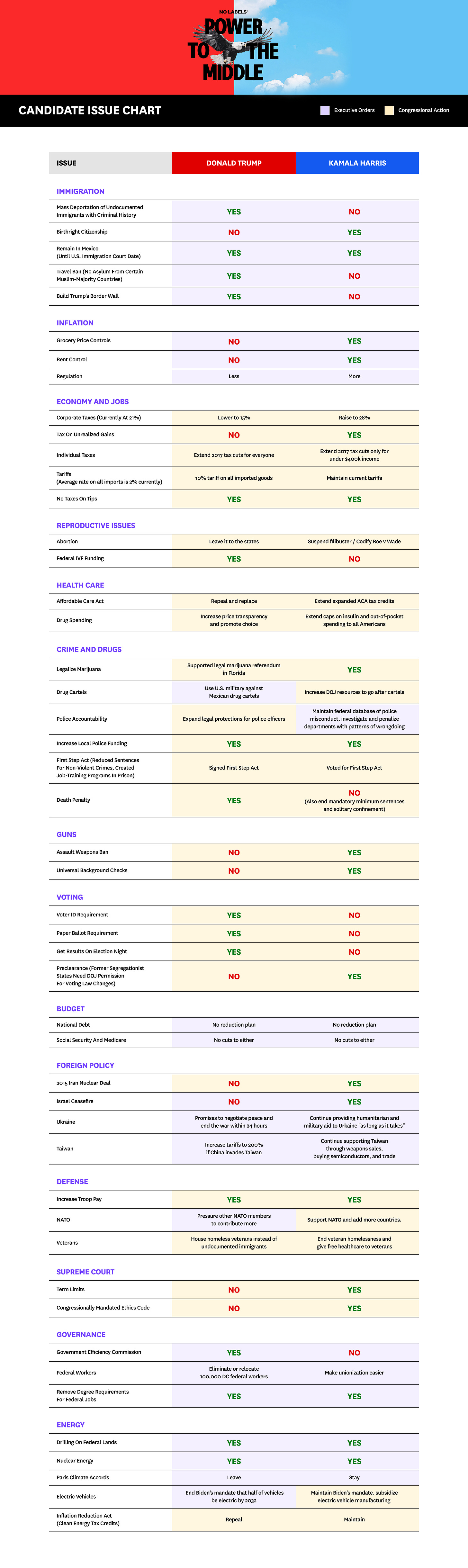 Read No Labels’ new breakdown of how Trump and Harris stack up on the issues voters care most about.